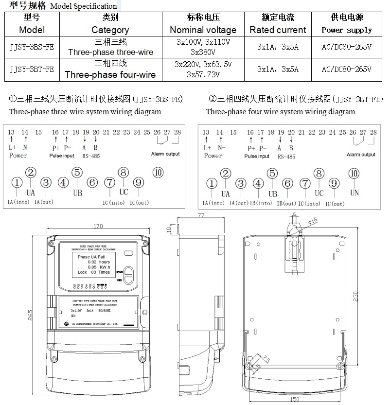JJSY系列三相失壓斷流計時儀適用于電力三相三線、三相四線系統(tǒng),通過對電網(wǎng)電壓(PT)回路、電流(CT)回路進行監(jiān)視,能準確判斷電網(wǎng)運行狀態(tài),并詳細記錄其處于故障期間的各種參數(shù),以便供電部門對電網(wǎng)進行管理,追補人為或非人為的漏計電能。 全英文菜單