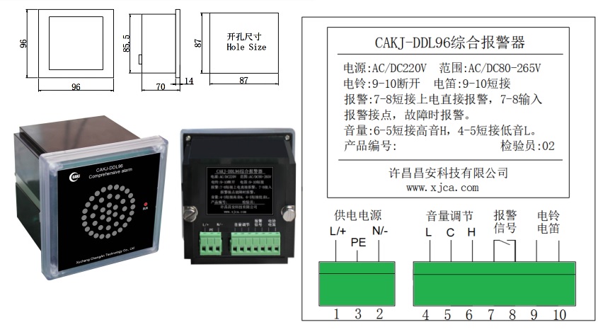 CAKJ-DDL96綜合報警器,是為電力系統(tǒng)中央信號報警而設(shè)計的一款低功耗、無干擾、大音量電子式報警設(shè)備。采用單片機(jī)模擬電磁式電鈴電笛聲音頻譜,其發(fā)聲與電磁式電鈴電笛發(fā)聲相似度達(dá)98%。