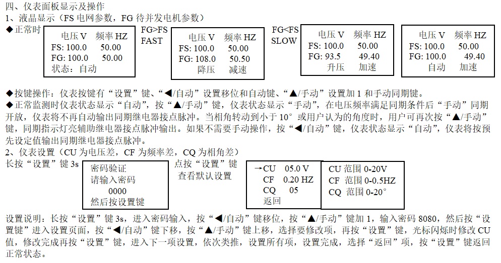 ◆當(dāng)待并聯(lián)發(fā)電機(jī)的電壓和頻率大于電網(wǎng)的電壓和頻率時,液晶顯示狀態(tài)“降壓 減速”,如果小于電網(wǎng)的電壓和頻率時,液晶顯示狀態(tài)“升壓 加速”。