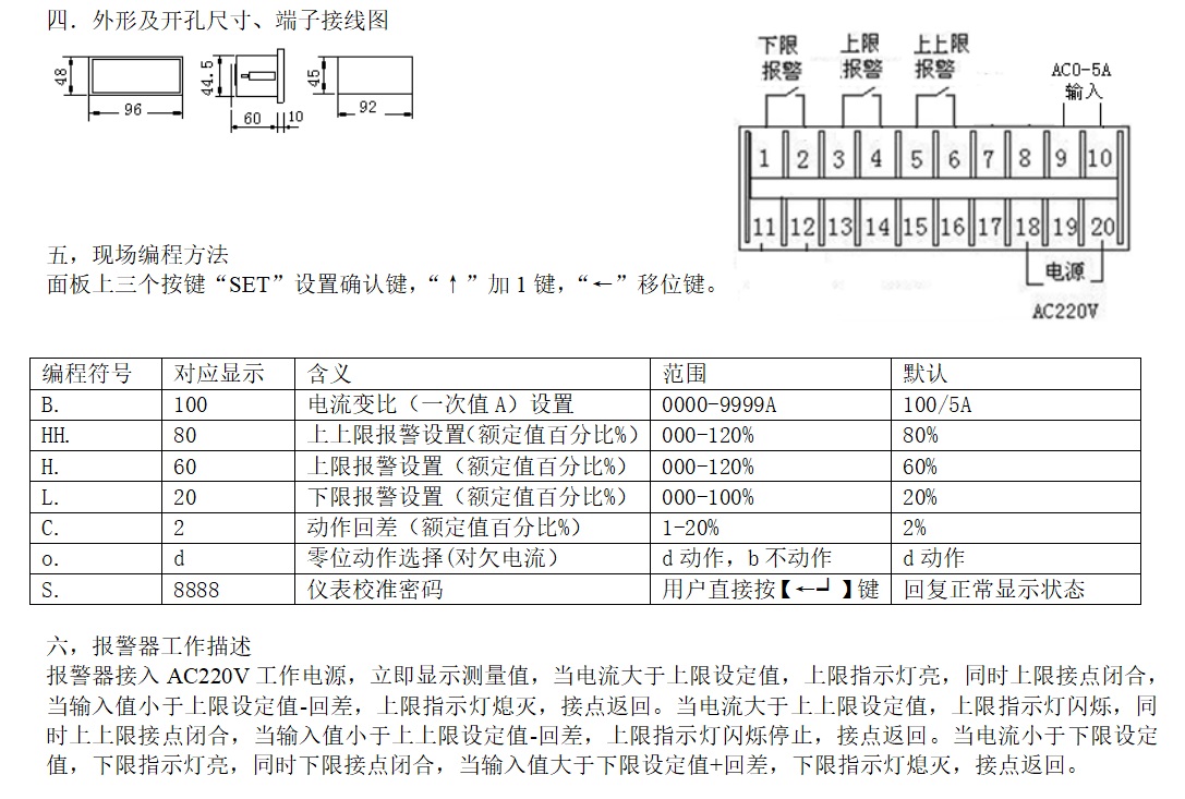 CAKJ494I(U)-3K交流電流電壓報(bào)警器適用于交流系統(tǒng)電壓電流測(cè)量顯示及報(bào)警。報(bào)警器采用高速AD轉(zhuǎn)換器及微處理器,對(duì)測(cè)量電流或電壓高速采樣實(shí)現(xiàn)過(guò)、低電流或電壓報(bào)警,報(bào)警輸方式采用繼電器接點(diǎn)輸出及指示LED。