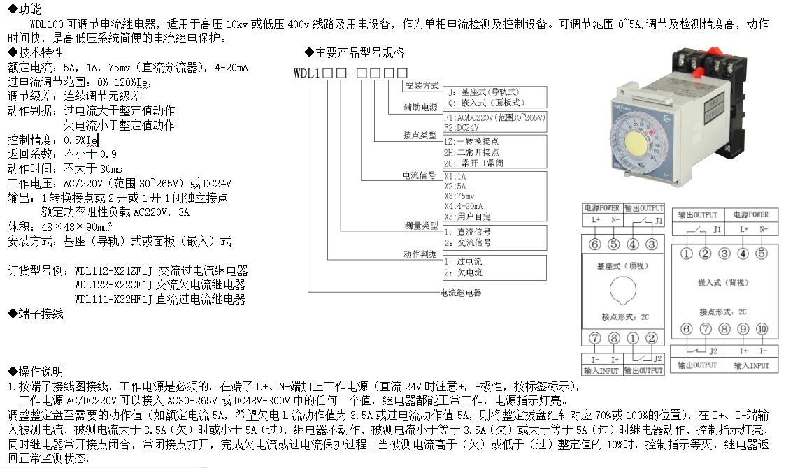 WDL100可調(diào)節(jié)電流繼電器,適用于高壓10kv或低壓400v線路及用電設備,作為單相電流檢測及控制設備。可調(diào)節(jié)范圍0~5A,調(diào)節(jié)及檢測精度高,動作時間快,是高低壓系統(tǒng)簡便可靠的電流繼電保護。