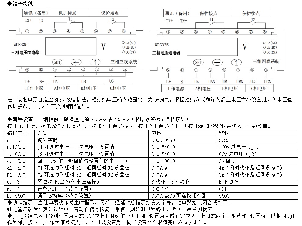 WDS335三相電壓監(jiān)視繼電器,適用于高壓35kv,10kv或低壓400v線路及用電設(shè)備,作為三相電壓檢測(cè)及控制設(shè)備。且具備過(guò)、欠電壓、缺相和延時(shí)動(dòng)作、返回功能,檢測(cè)精度高,是高低壓系統(tǒng)簡(jiǎn)便可靠的三相電壓繼電保護(hù)。