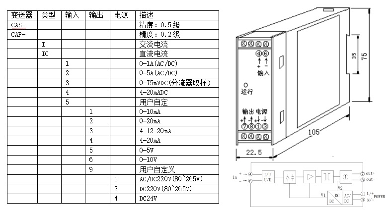 CAS系列電量變送器是將被測交直流電流、電壓等信號轉(zhuǎn)換成按線性比例輸出直流電流、電壓并隔離的設(shè)備,配以相應(yīng)的指示儀表或裝置是電力系統(tǒng)、遠(yuǎn)動裝置、自動化控制系統(tǒng)等可選擇的模擬量采集模塊。執(zhí)行標(biāo)準(zhǔn)GB/T13850.1-92