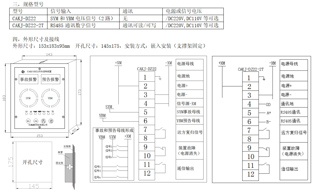 輸入信號(hào):SYM事故信號(hào),YBM預(yù)告信號(hào),有源電壓信號(hào)輸入;RS485通訊輸入。