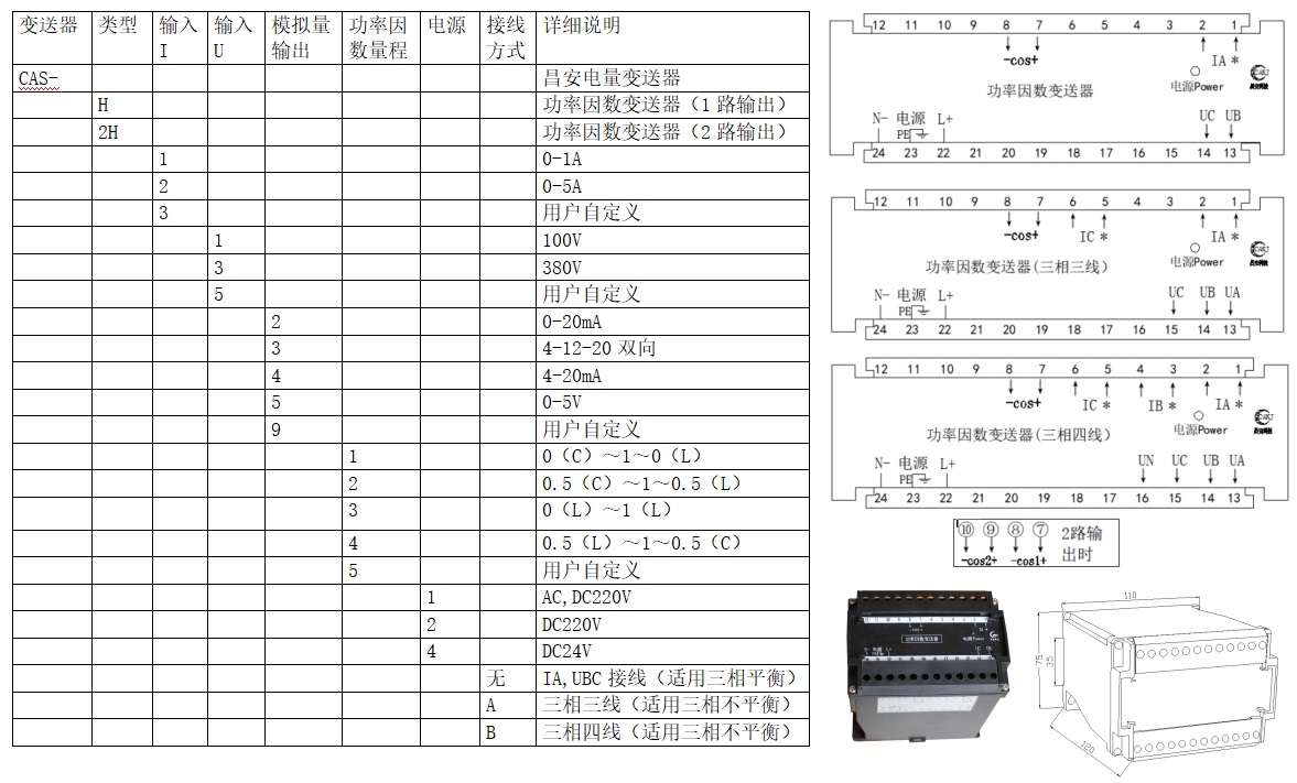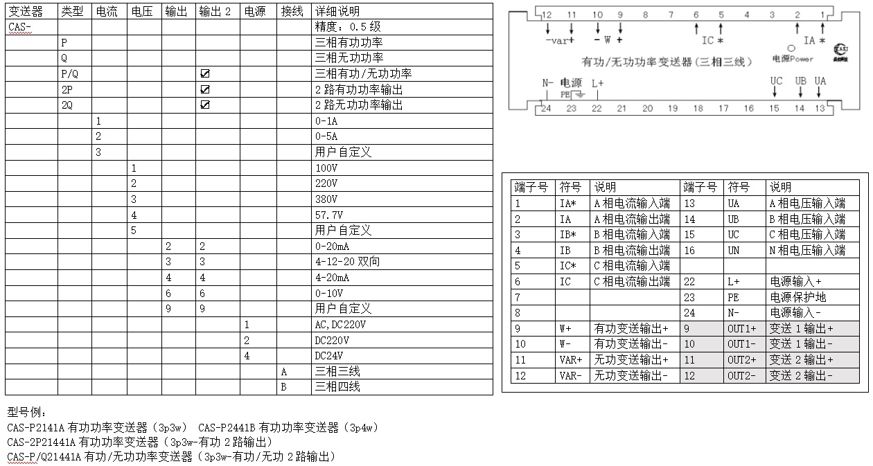 CAS系列功率變送器是將被測電流、電壓信號,通過內部CPU計算出有功功率、無功功率、功率因數(shù)等參量并輸出4-20mA等模擬量的設備。