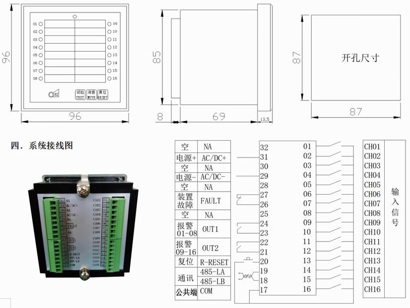 a.16個(gè)LED指示燈分別指示各路信號(hào)狀態(tài)(正常-滅,報(bào)警-閃光,消音-亮,正常后按復(fù)位鍵-滅)。