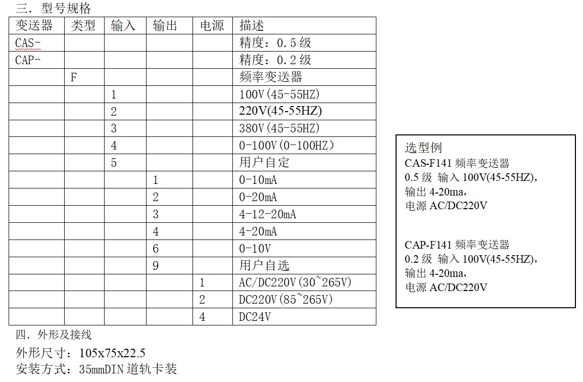 CAS系列頻率變送器是將被測電壓頻率信號轉換成按線性比例輸出直流電流、電壓并隔離的設備,配以相應的指示儀表或裝置是電力系統(tǒng)、遠動裝置、自動化控制系統(tǒng)等可選的模擬量采集模塊。