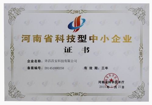 2015年1月21日,許昌昌安科技有限公司被河南省科學(xué)技術(shù)廳認(rèn)定為“河南省科技型中小企業(yè)”,并頒發(fā)證書。