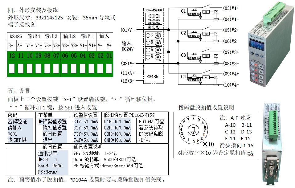 4,模塊通過面板上“SET”設(shè)置鍵、“←”循環(huán)移位鍵、“↑”循環(huán)加1鍵。在液晶屏上分別設(shè)置4路預(yù)警電流值,脫扣電流值(PD104B有效),當(dāng)某路電流超過預(yù)警值,該路指示燈閃爍。當(dāng)某路電流超過脫扣值(PD104B有效),該路指示燈滅,回路被自動斷開,重新接通該回路需手動按投入鍵。